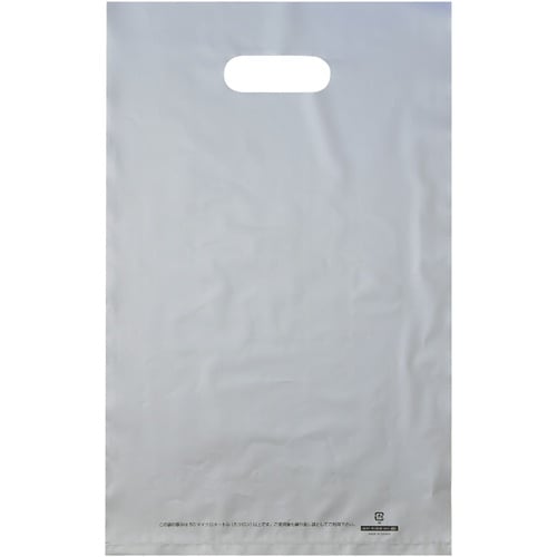 ポリエチレン製の手抜きタイプの手提げ袋です。パリッとしたハードタイプ。本体裏面にバーコード等情報が記載されています。 |