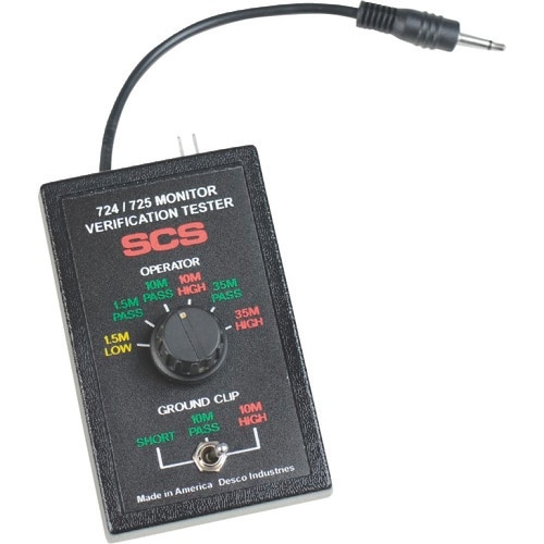 724ワークステーションモニターおよび725ポータブルリストストラップモニターのテスト制限を作業場にて確認することができます。725ポータブルリストストラップモニターの接地回路を確認します。 |