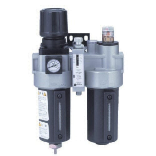エアフィルター、レギュレータ、ルプリケータ機能を専用アタッチメントで接続したモジュラタイプのユニットです。金属ボトルを標準装備。圧力計、プラケットを標準装備。圧力スイッチ付きです。 |