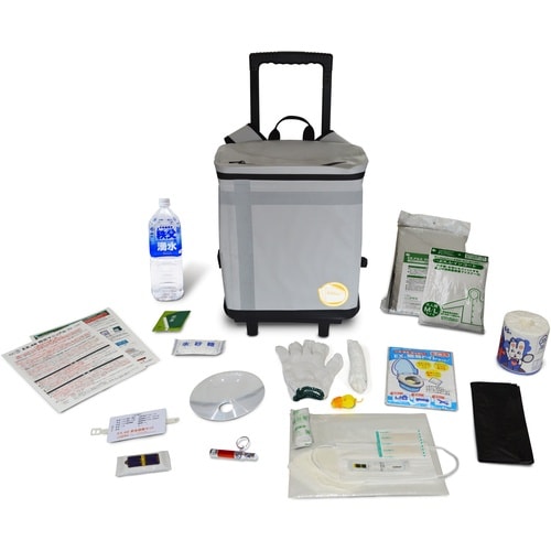 笛・コンパス付きLEDライト×1、マスク×1、トイレットペーパー×1、簡易トイレセット(3枚入)×1、ガーゼ付救急絆創膏×2、医療用体温計×1、アルミシート×1、収納ポーチ×1、ろ過フィルター×2、軍手・笛・ロープセット×1、雨衣×1、ごみ袋×1、うちわ兼用拡大鏡×1、ネームカード・災害時連絡リスト×1、防災マニュアル×1