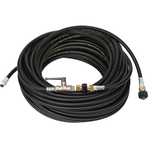 止水用のコック付きです。外層が樹脂のため、パイプ・継手に傷がつきにくいです。高圧洗浄機の洗管用ホース。 |