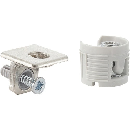 固定ねじを締めると、棚板を固定できる棚受です。取付加工図※印の穴加工を行うと、上側からも固定ねじを締められます。取付ねじを締めると取付穴の内部でブッシュが広がり固定します。 |