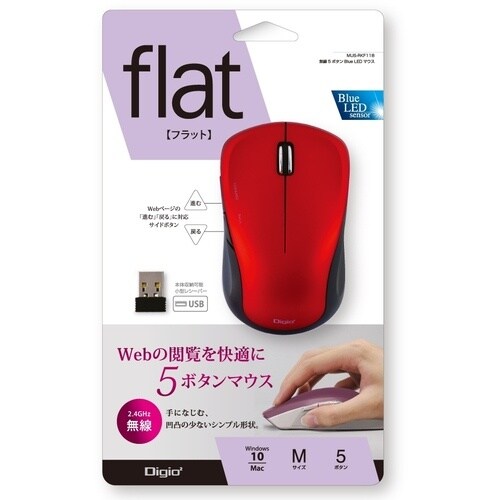 フラットで使いやすい、幅広ボタンです。サイドのくびれで左右からホールドしやすいです。インターネットに便利な、ブラウザの「進む」「戻る」に対応。小型レシーバーは本体に収納可能。 |