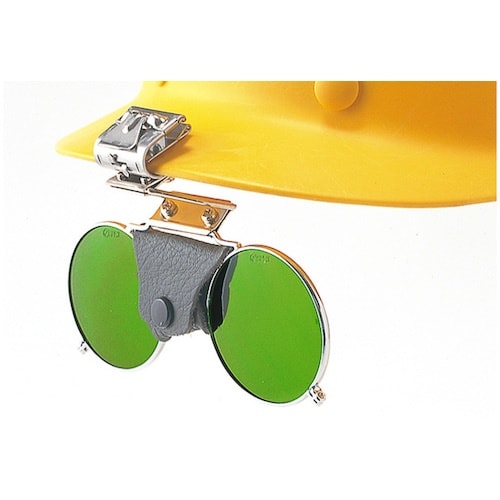 MP型ヘルメットにワンタッチで取付可能です。使用しない時には跳ね上げておけるので視界の妨げになりません。フレームがないため下方視界がよく足元に不安がありません。 |