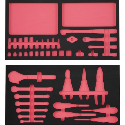 二層式発泡収納トレイです。使用中の工具の置き場所が赤くなり、「一目」で分かります。工具の置き場所が決まり、探すムダ、紛失リスク、重複した購入等を防げます。 |