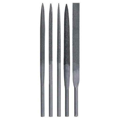 中目のヤスリ、平・半丸・丸・角・三角の5種類(各1本ずつ)をセットにしました。一般ヤスリ、鉄系研削用。 |