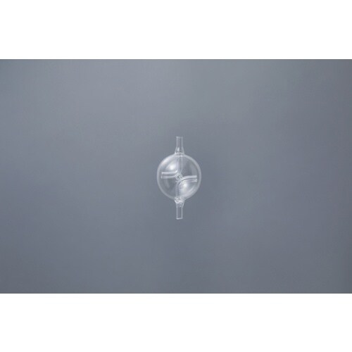 ガラス製でガスの吸着が少なく、動的なガス発生でも混合に十分なスペースを確保した容量です。2つの流路で調整したガスを連続的に混合する、または、一つの流路で調製したガスを連続的に2方向に分岐します。 |