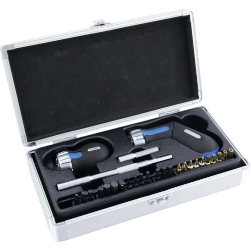 ピストル型ギアドライバーとスタビーギアドライバーの2本のラチェットドライバーが標準装備されています。ピストル型ギアドライバーは、ストレート・ピストル型の2通りの使い方ができます。 |