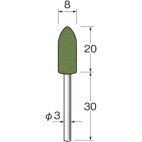 粒度(#):220 | 軸径(mm):3 | 軸長(mm):30 | 最高使用回転数(rpm):30000 | その他仕様:多種類の形状と粒度を揃えま…