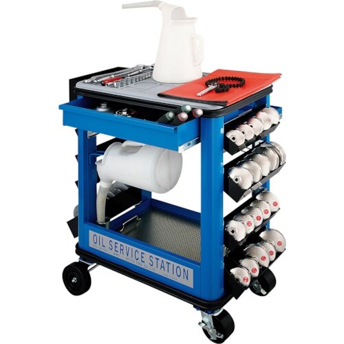 オイル交換作業全般を効率よく行なうためのワゴン(SKR81)とオイル交換用工具のセットです。入組点数72点です。 |