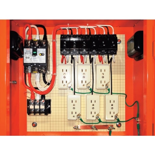 仮設電灯分電盤の標準型です。大阪府の自社工場で設計、製造しています。部分的な修正・変更から、フルオーダーまで、別作対応可です。工事現場のコンセント、照明や工具等の電源に。 |