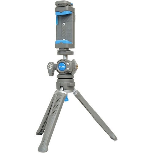 スマートフォン、カメラ、ビデオカメラに対応する、テーブル三脚です。スリムに折りたためるポケット三脚に、スマートフォンホルダーを装備。脚の基部はアルミ製で、2段階の開脚機構付き。