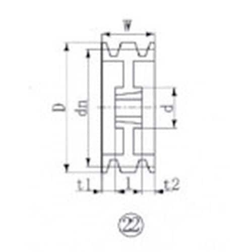 データム径(mm):280 | 溝数:6 | 図面番号:22 | 適用ベルト:C、CX | 材質・仕上げ:ねずみ鋳鉄 | 単位:1個