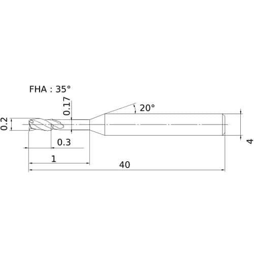 刃数ZEFP(枚):3 | 切削径DC(mm):0.2 | 最大切込みAPMX(mm):0.3 | 使用可能長さLU(mm):1 | 機能長さLF(m…