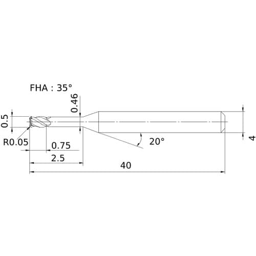 刃数ZEFP(枚):4 | 切削径DC(mm):0.5 | コーナ半径RE(mm):0.05 | 最大切込みAPMX(mm):0.75 | 使用可能長…