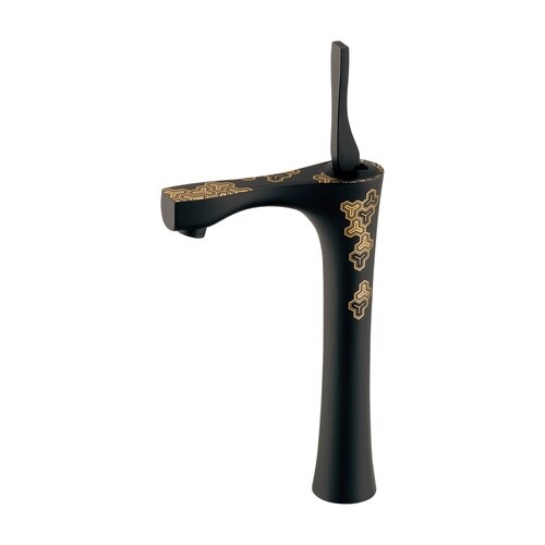 日本の伝統的な吉祥紋様と漆黒の本体が、和の手洗い空間を凛とした格式高い印象に仕上げます。