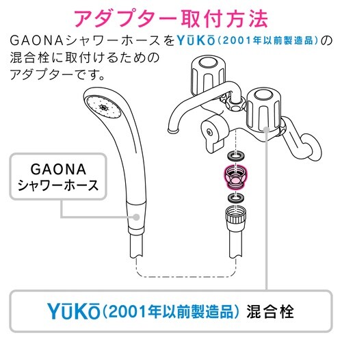 GAONA・KAKUDAIなどのシャワーホースと2001年以前に製造されたYUKOの混合栓を接続するアダプターです。 |