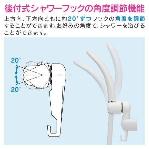 既存のシャワーフックにそのまま取付できる、角度調節機能付きのシャワーフックです。 |