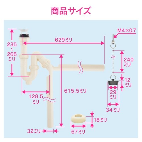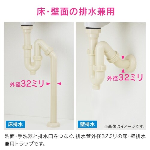 32ミリ規格のオーバーフロー付き洗面・手洗器用樹脂製排水トラップです。 |