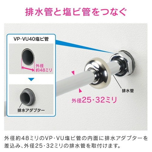 床・壁面の排水用呼40塩ビ管と排水管をつなぐアダプターです。 |