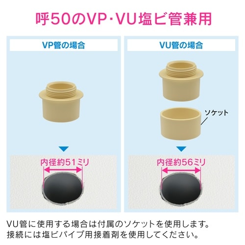 床・壁面の排水用呼50塩ビ管と排水管をつなぐアダプターです。 |