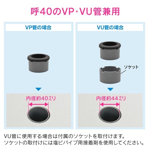 床面の排水用呼40塩ビ管と排水管をつなぐアダプターです。 |