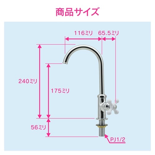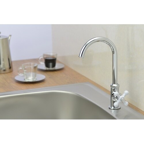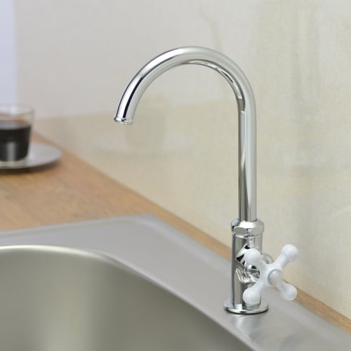 ホワイトクロスハンドルがオシャレな呼13の立形スワン水栓です。 |