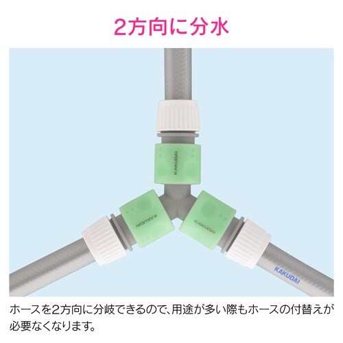 ワンタッチでホースにつないで2方向に分水するジョイント部品です。 |