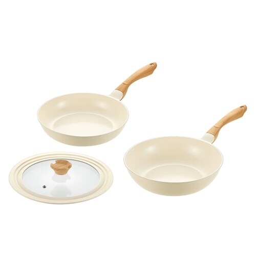 フライパン26cm(ハンドル含む)/570g、いため鍋28cm(ハンドル含む)/690g、兼用ガラス蓋/630g