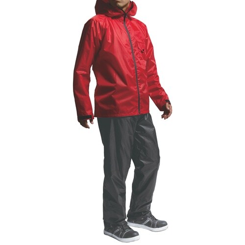 長持ちする撥水加工を表地に採用。フードも足元も好みにピッタリ合わせるカンタン調節付きレインスーツ。