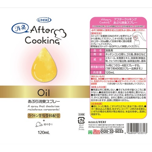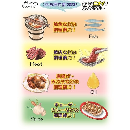 唐揚げや天ぷらなどの調理後にスプレーするだけで、気になるニオイを消し去ります。 |
