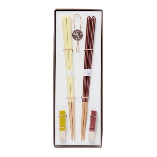 サイズ:箸23cm/箸置き1×1×5.3cm | 材質:天然木/ポリエステルウレタン塗装(箸)、陶器(箸置き) | 単位:1個