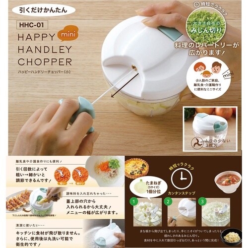 フタ部分・ハンドル・回転刃芯部分/ポリプロピレン(耐熱温度 100度、耐冷温度 −20度)、ヒモ/ナイロン、ヒモ口部分/銅、容器/ポリスチレン(耐熱温度 80度、耐冷温度 −20度)、滑り止め/シリコン、刃/ステンレス刃物鋼