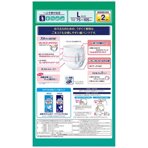 サイズ(約):L(ウエスト75−105cm) | 入数:20枚 | 吸収回数:おしっこ2回分(約300ml) | 単位:1個