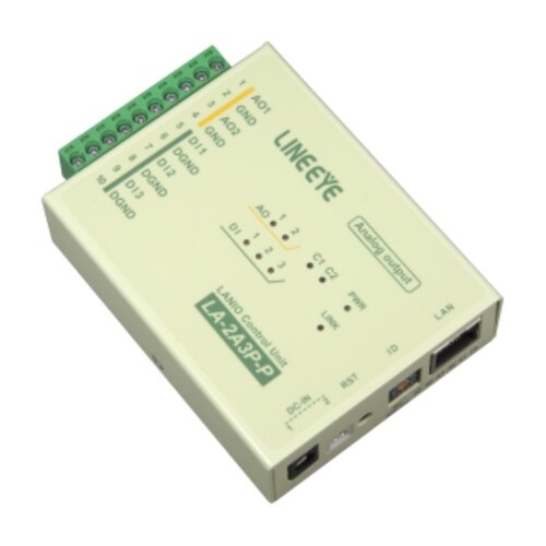 パソコンからLAN(イーサネット)経由で、アナログ出力2点、ドライ接点入力3点を監視制御できるIOユニットです。 |