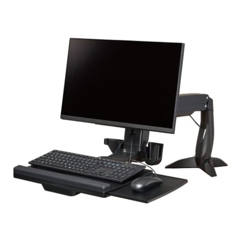 テーブルクランプ型のワークステーション。立ち・座り作業がフレキシブルに選択できます。 |