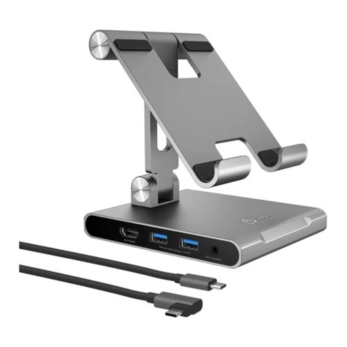 無段階調整できるタブレットスタンド。PD充電しながらHDMI大画面ディスプレイに増設できるドッキングステーション搭載。 |