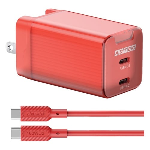 PD対応 AC充電器/GaN/65W/USB Type−C 2ポート/レッド&Type−CtoCケーブルセット |