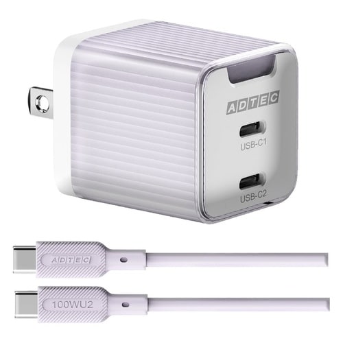 PD対応 AC充電器/GaN/45W/USB Type−C 2ポート/パープル&Type−CtoCケーブルセット |