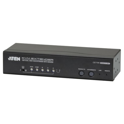 2系統のVGA信号およびUSBキーボード/マウスの信号をカテゴリ5e/6ケーブル2本で延長し、最大300m離れた場所でデュアルディスプレイに出力できるKVMエクステンダーです。 |