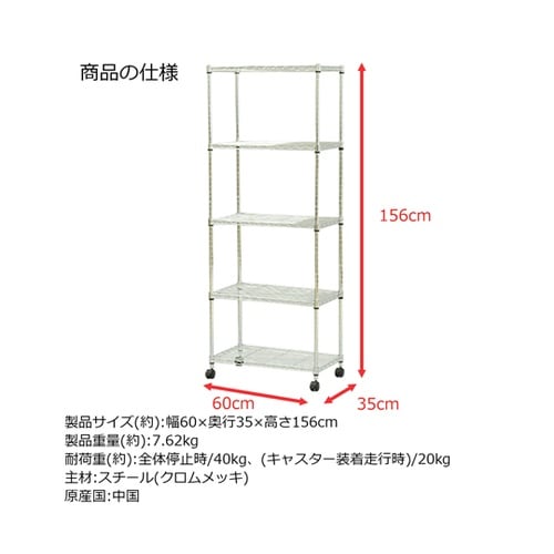 製品サイズ(約):幅60×奥行35×高さ156cm | 製品重量(約):7.62kg | 耐荷重(約):全体静止時・40kg、走行時・20kg(キャス…