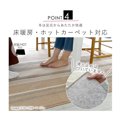 4人掛けダイニングテーブルに適したサイズのラグ。ランダムなストライプデザインがダイニングルームをさりげなく演出します。裏面は耐熱加工の為ホットカーペットカバー、床暖房にも対応しています。 |