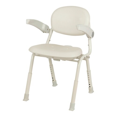 外寸法はコンパクトながら、アーチ型肘掛けの採用で体格のよい方も楽に座っていただけます。座面後方のレバーを下げて、背もたれを持ち上げるだけの簡単折りたたみタイプです。 |