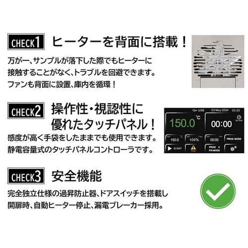 安心の背面ヒーター/タッチパネルを搭載した新デザインオーブンヒーターは底面に配置しておりません。USBフラッシュメモリを接続し、記録できます。風量が3段階(100/75/50%)で調節可能です。 |