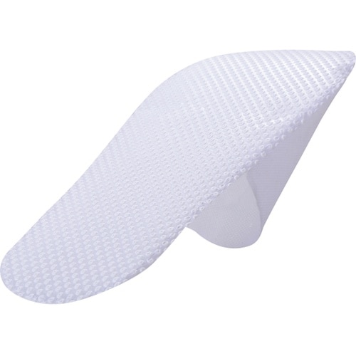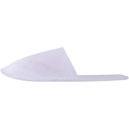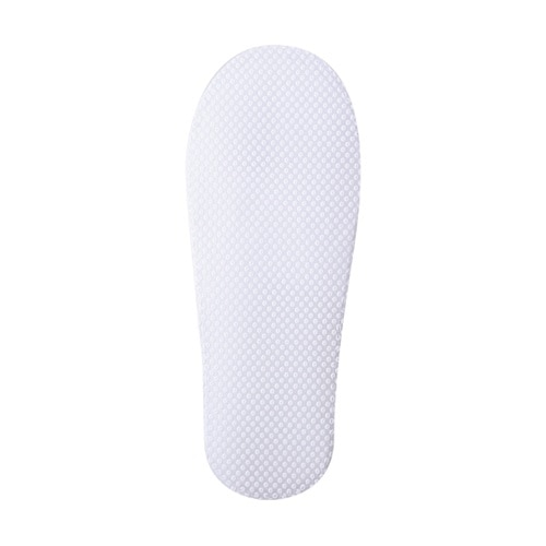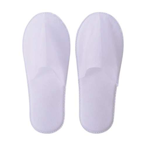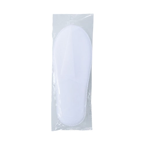 不織布素材の使いきりスリッパです。1足ずつビニール袋に個包装されています。つま先まで覆う「かぶり」タイプです。底面には滑り止めの模様が付いています。 |