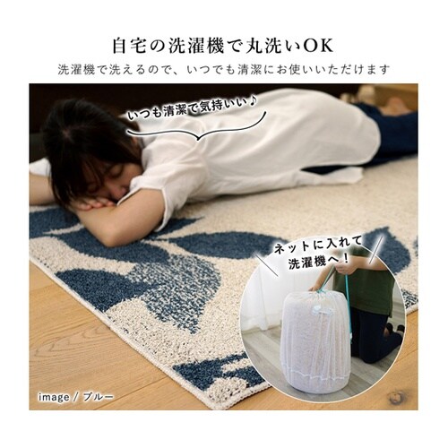 大胆なリーフ柄をショートパイルシャギーでタフトで表現。防音性能で階下に音が響くのを和らげます。ご家庭の洗濯機で丸洗い可能。