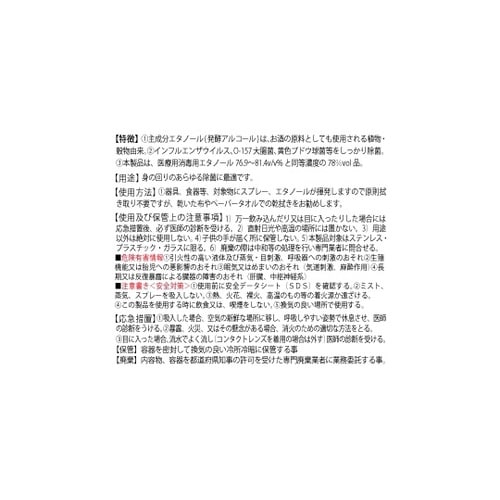 主成分エタノール(発酵アルコール)は、お酒の原料としても使用される植物・穀物由来。ウイルスをしっかり除菌。本製品は、医療用消毒用エタノール76.9ー81.4v/v%と同等濃度の78%vol品。 |