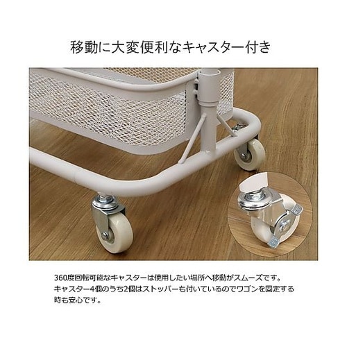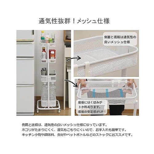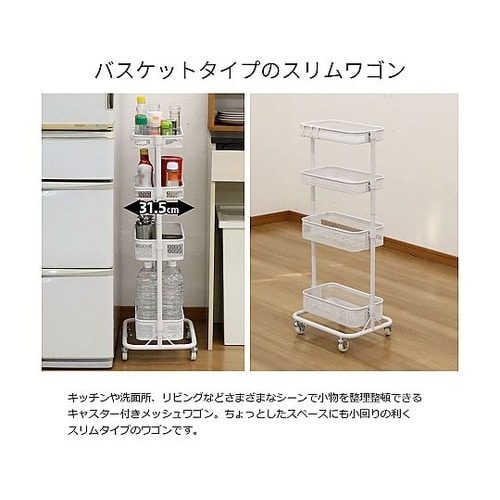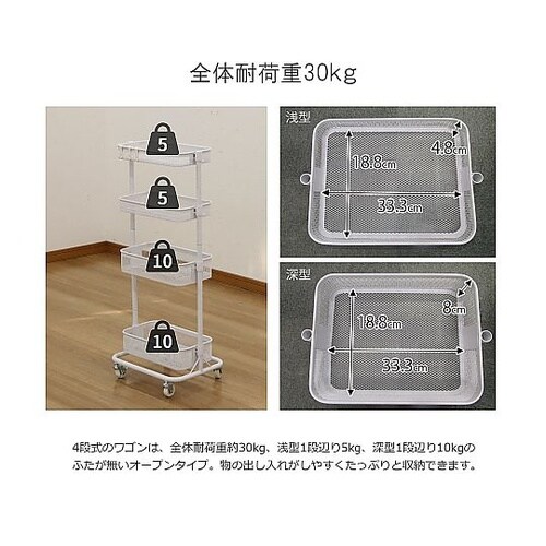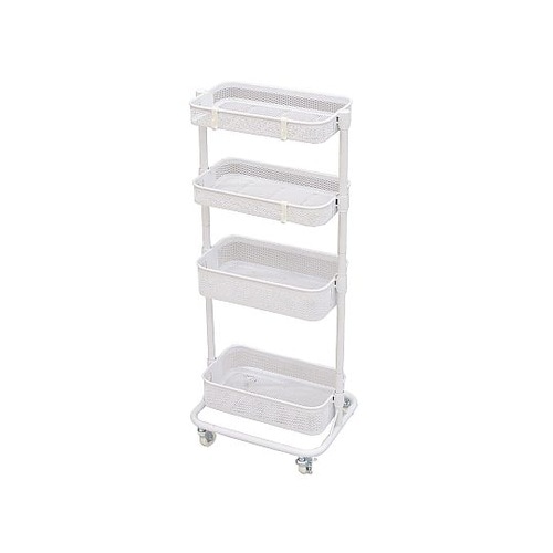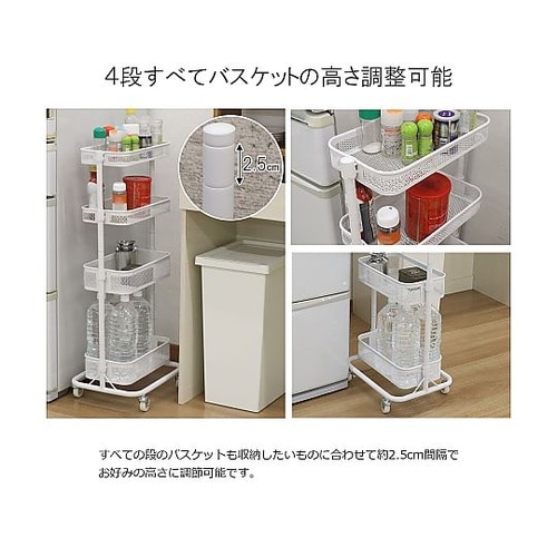 収納に便利なメッシュワゴン。浅型の棚2段、深型のバスケット2段、計4段に分けて収納することができます。全ての棚・バスケットが、約2.5cm間隔で高さ調節可能です。 |
