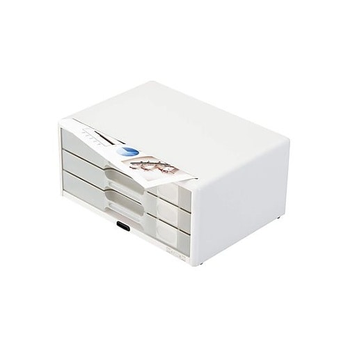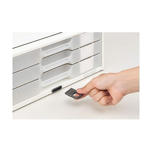 セキュリティホール付鍵2本付デスクまわりが明るくなる、爽やかなオールホワイトカラーで、樹脂製引出しに施錠機能が付いたカギ付レターケースです。1つのカギで全段の施解錠ができます。 |