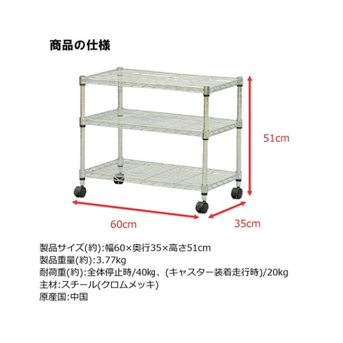 製品サイズ(約):幅60×奥行35×高さ51cm | 製品重量(約):3.77kg | 耐荷重(約):全体静止時・40kg、走行時・20kg(キャスタ…